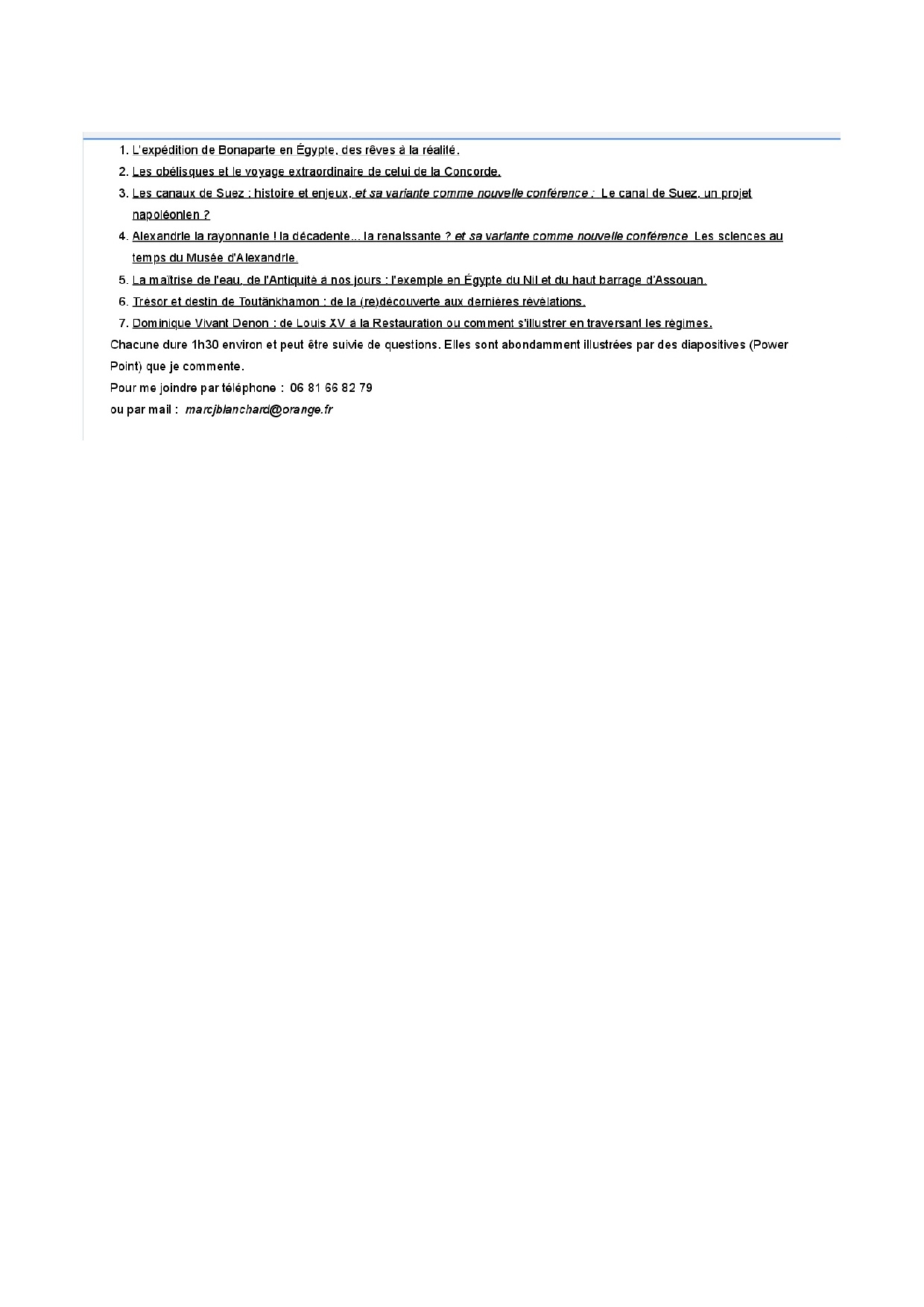 Retraité je m'adonne à mes passions conjuguées que sont l'histoire et l’Égypte en proposant et en présentant des conférences ( le plus souvent dans des UTL ou UIA de France ou même de Belgique et de Suisse .